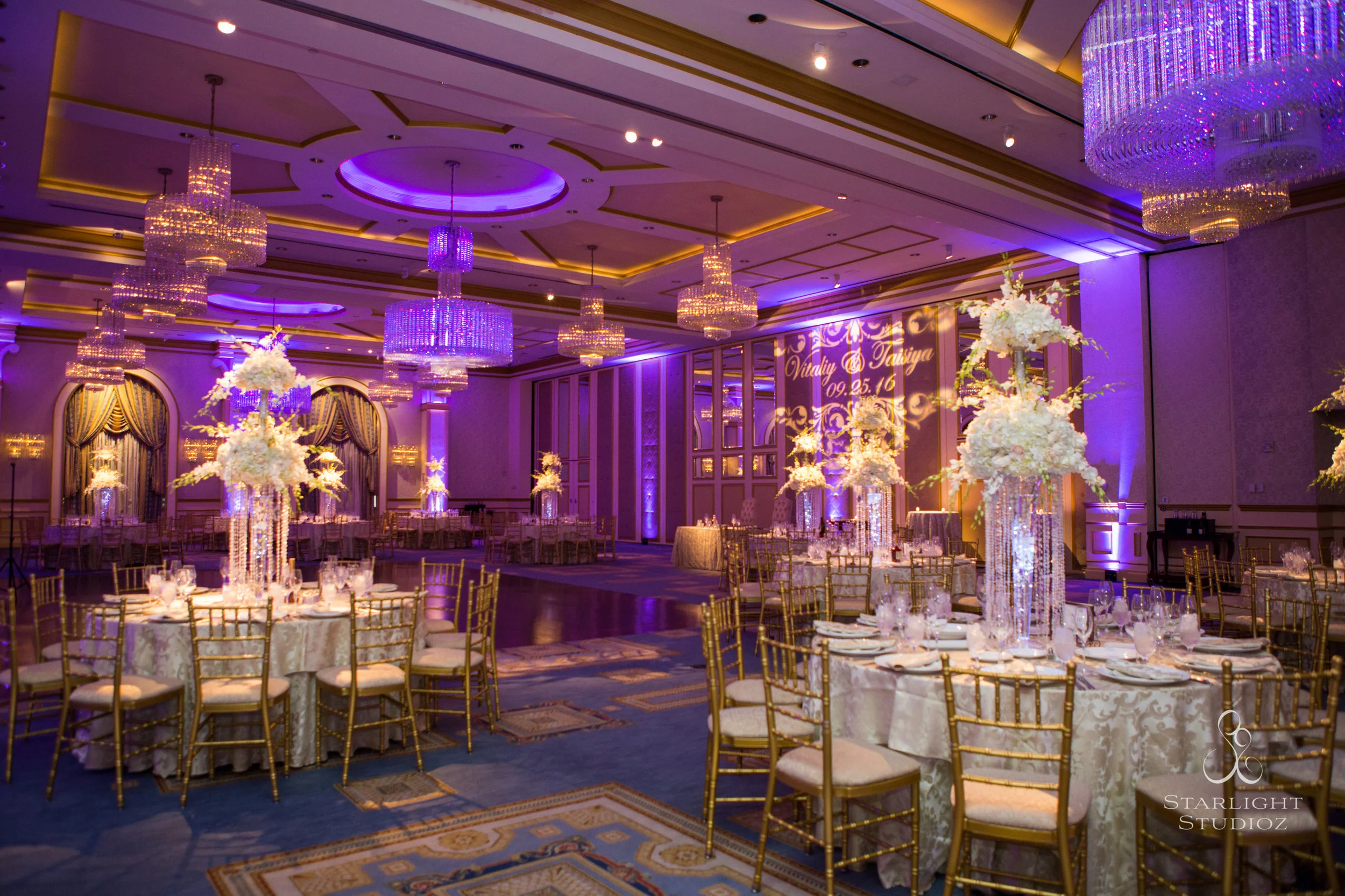 This past September we provided entertainment, audio and lighting services at the wedding of Vitaliy and Taisiya at the elegant Grove in New Jersey. Our friends at Starlight Studioz captured this photo that perfectly shows the feeling we were trying to create for our clients. The custom monogram is the perfect cherry on top of this very well lit cake.